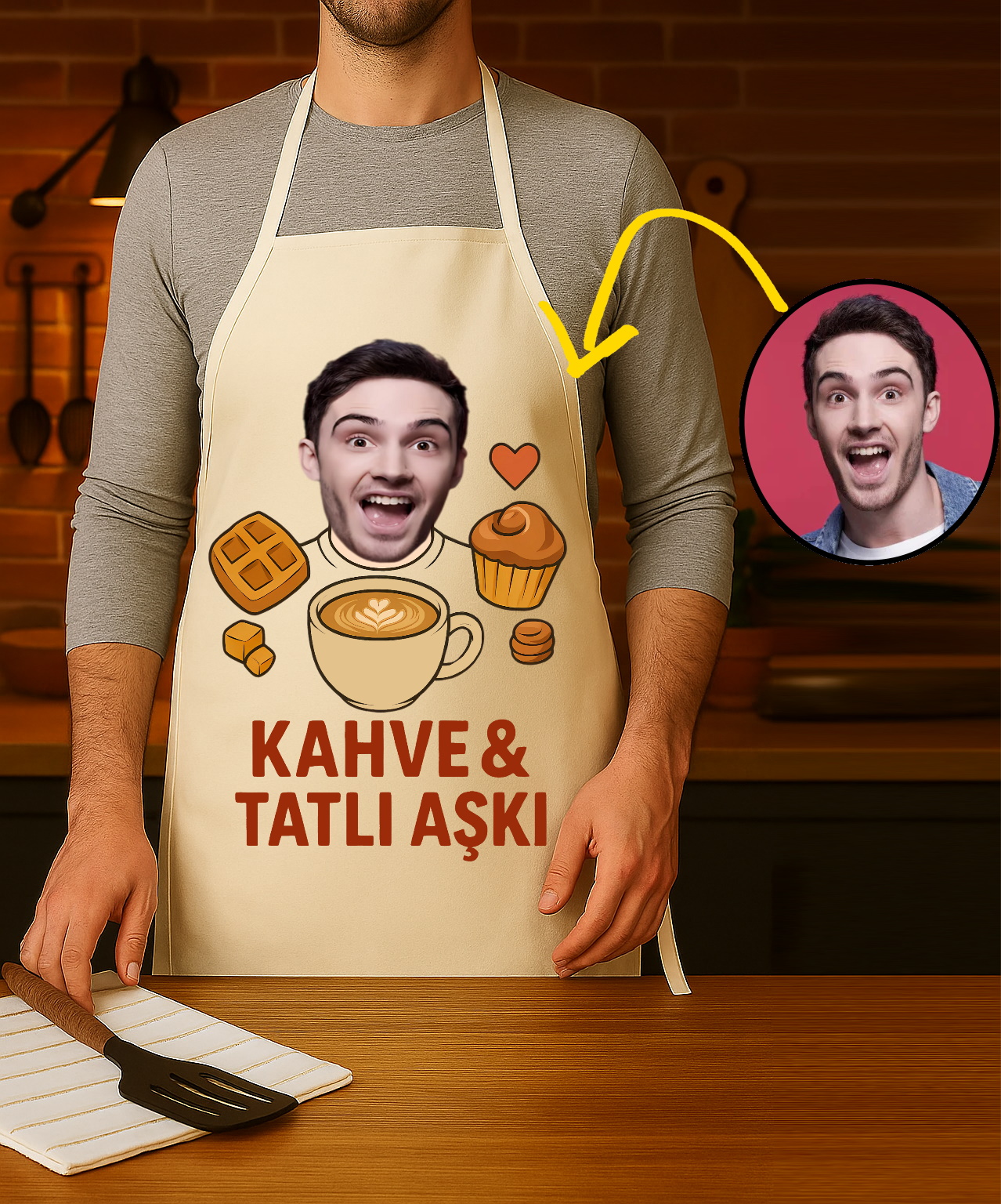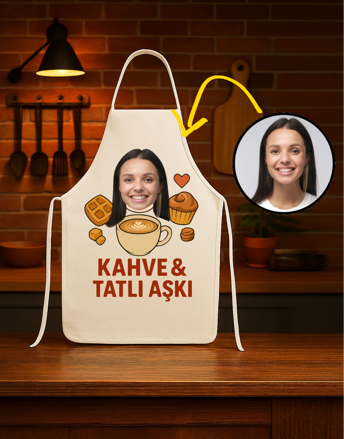 Kişiye Özel Karikatür Fotoğraflı ve İsimli Mutfak Önlüğü Kahve Tatlı Aşkı